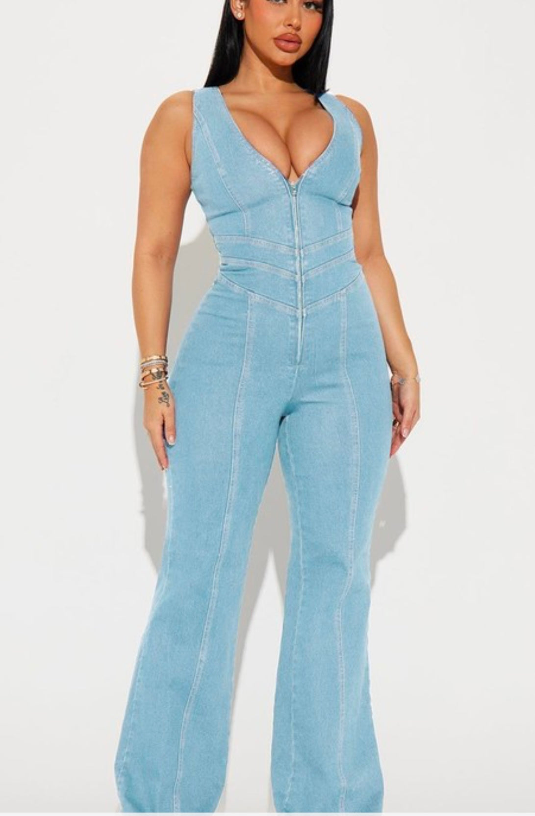 This light blue denim jumpsuit features: